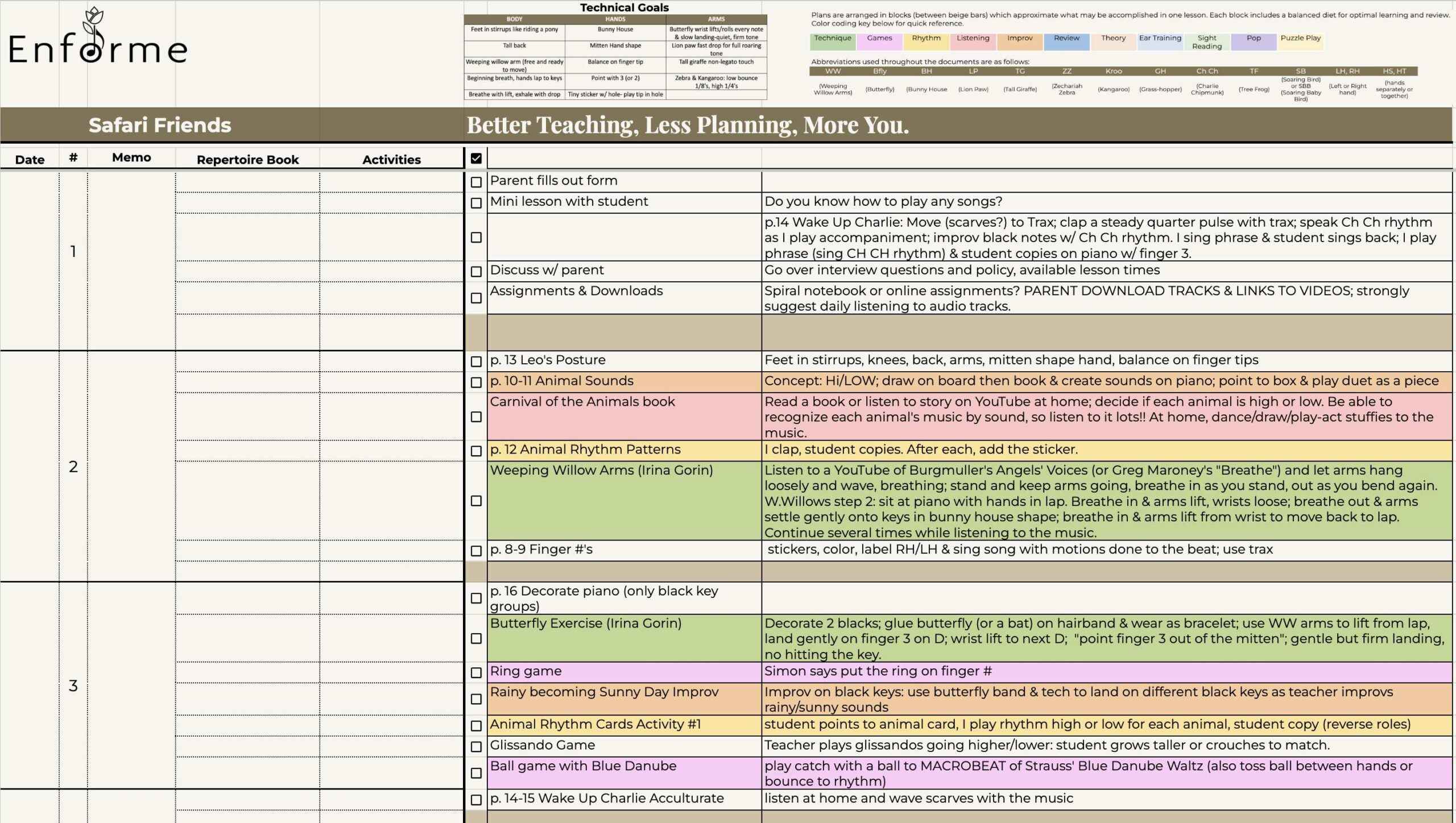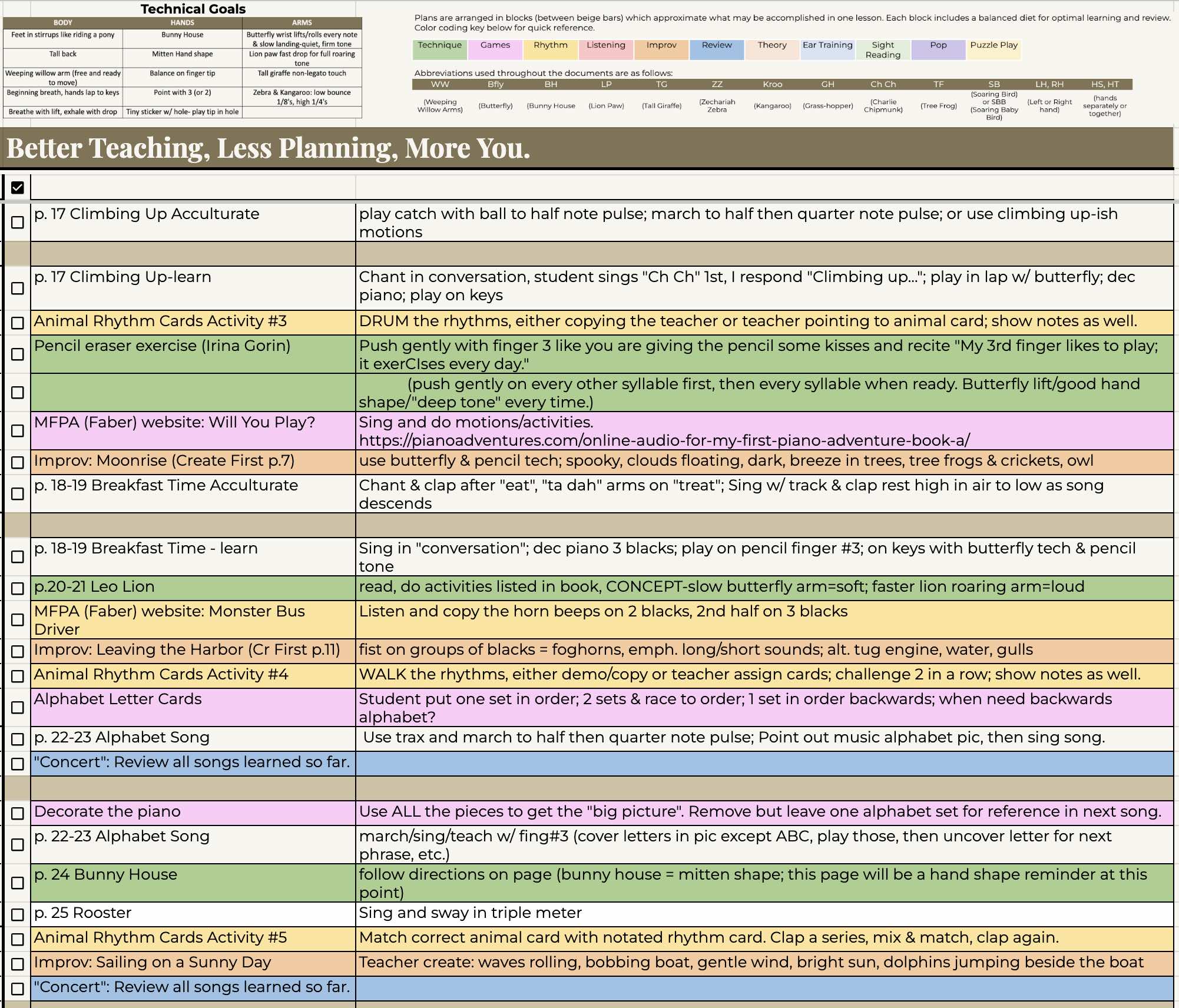 “Piano Safari Plus” sequences the Piano Safari curriculum* plus a wealth of supplementary materials into an easy-to-follow checklist-style map. A quick glance at the map during lessons allows you to flow seamlessly from one activity to the next with minimal prep time before the lesson. The map ensures you remember to cover important concepts while sequencing materials in optimal order. In addition to the Piano Safari repertoire, technique, and theory books, sightreading cards, animal rhythm pattern cards, and Piano Safari teacher resources, the “plus” curriculum map integrates the following resources: