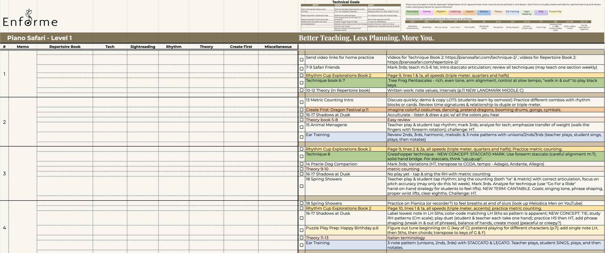 “Piano Safari Plus” sequences the Piano Safari curriculum* plus a wealth of supplementary materials into an easy-to-follow checklist-style map. A quick glance at the map during lessons allows you to flow seamlessly from one activity to the next with minimal prep time before the lesson. The map ensures you remember to cover important concepts while sequencing materials in optimal order. In addition to the Piano Safari repertoire, technique, and theory books, sightreading cards, and Piano Safari teacher resources, the “plus” curriculum map integrates the following resources: